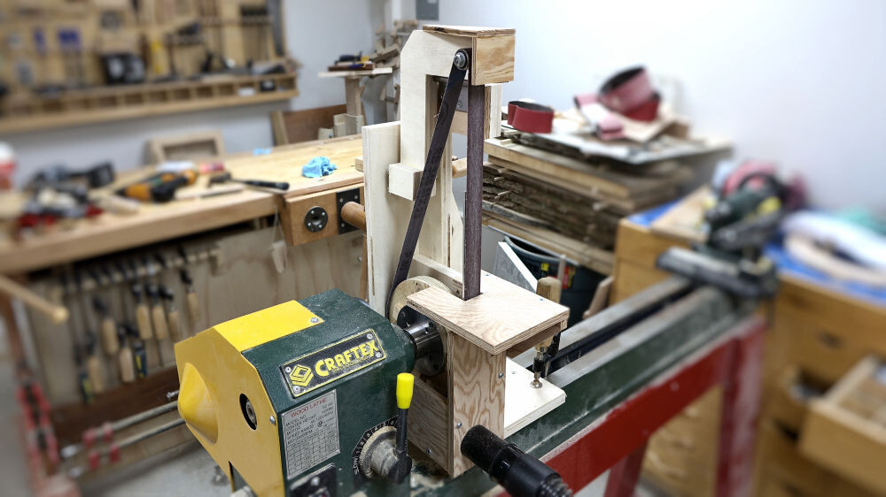 This easy to build 1 x 42 belt sander will attach to your lathe and put it to work shaping and sharpening. When not in use, it can be quickly taken off and stored until the next time you need it.